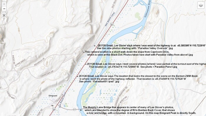 …6) A good place to gain the necessary elevation, AND have the correct alignment of the River + Bridge, with the slopes on the Right Flank of Emigrant Peak => Starting at the above TopoAone Map, marked Black Dot + Examination.saying “Paradise Valley Overlook”, then From Canal Crossover Road, walk Southwest along the Capricorn Drive, which will climb UP the slope => To high enough elevation, so the river and bridge, can be seen without being blocked by trees.
