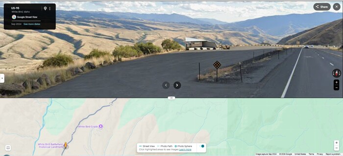July 2024 Added: … Google Street View Shows The Turnoff To A Historical Marker And A National Park Service Information Kiosk Shelter With National Park Service Information Displays About => “White Bird Battlefield" And "The Nez Perce National Historical Park”.