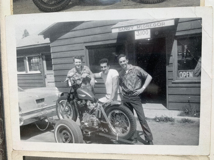 …Seeing This Photo, Prompted Bill Quaccia To Say -=> “Unknown gentlemen posing in front of Sandy’s shop with early Iron Sportster custom on a trailer. (tin Primary, rear shocks had been replaced with struts). …. Sandy was known to take pictures of visitors to his shop, he usually wrote names on back of photo. …. Who can ID the auto pulling the trailer? Chrysler Imperial??”