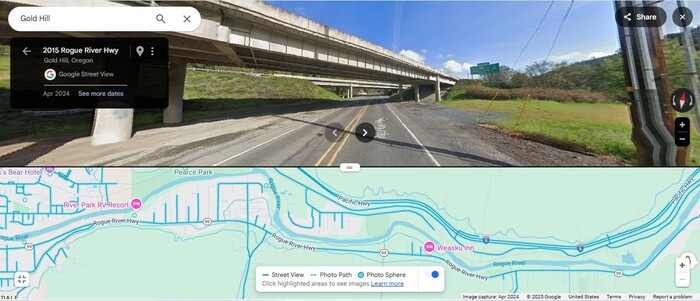 …Started Looking For A Way To Go Under The I-5 Bridges (Seen Above), And Soon Cross Over The Rogue River, Get On The Rogue River Road Rt-99, To Be Able To Drive To The McGregor Welding Shop.