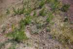 …We See Pine Tree Seedlings Surround A Greenish-Grey Plant, Growing In Roadside Gravel.