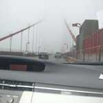 As We Approach The On-Ramp Of The Golden Gate Suspension Bridge, We Can See, Despite The Fog, The Two Giant Red Colored Bridge Support Cables, Angle Up, And Disappear Into The Fog!