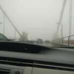 As We Start Onto The Golden Gate Suspension Bridge, We Can See, Despite The Fog, A Much Better View Of The Two Giant Red Colored Bridge Support Cables Angle Up, And Disappear! Into The Fog!