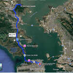 Added July, 2004 … A Google Satellite View Shows David Matos & Henry Gurr’s Travel Route => FROM Their Campground, At China Camp State Park, Near Shore Of San Pablo Bay, Near San Rafiel, CA, THRU Marin County Civic Center, San Rafael, CA, Along US-101 Over Golden Gate Bridge TO Herbert Hotel, Downtown San Francisco CA.