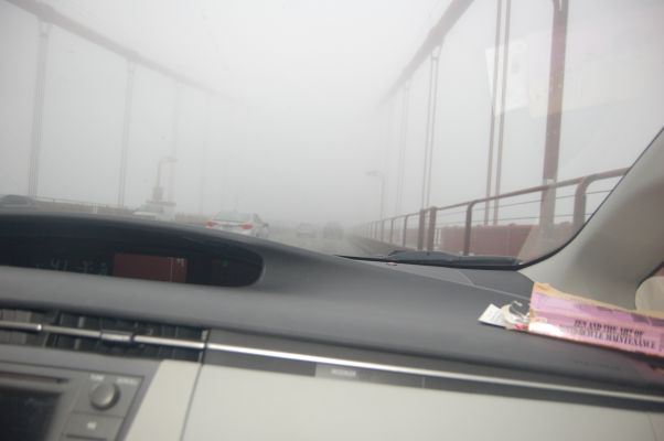 Continuing Along The Golden Gate Suspension Bridge, We Can See, Despite The Fog, A Much Better View Of The Two Giant Red Colored Bridge Support Cables Angle Up, And Disappear!