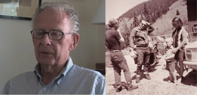 The photo of the right shows John Sutherland (center) arriving at the Cottonwood Canyon, Gallatin Gateway, Montana home of the Robert and Gennie DeWeese on July 13, 1968. Robert DeWeese is on the left and Gennie DeWeese and her son Josh are on the right. This photo is one of several new photos published in 2021 by the Smithsonian's Paul F. Johnston in