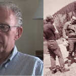 The photo of the right shows John Sutherland (center) arriving at the Cottonwood Canyon, Gallatin Gateway, Montana home of the Robert and Gennie DeWeese on July 13, 1968. Robert DeWeese is on the left and Gennie DeWeese and her son Josh are on the right. This photo is one of several new photos published in 2021 by the Smithsonian's Paul F. Johnston in